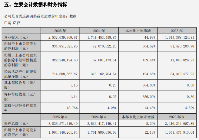 2025年,長(zhǎng)芯博創(chuàng)實(shí)現(xiàn)營(yíng)業(yè)收入25.33億元,較2024年的17.47億元同比增長(zhǎng)44.93%;歸屬于上市公司股東的凈利潤(rùn)達(dá)3.35億元,同比大幅增長(zhǎng)364.62%;扣除非經(jīng)常性損益后的凈利潤(rùn)為3.22億元,同比增幅更是達(dá)到459.44%。同時(shí),公司經(jīng)營(yíng)活動(dòng)產(chǎn)生的現(xiàn)金流量?jī)纛~為7.15億元,同比增長(zhǎng)124.65%,現(xiàn)金流狀況持續(xù)改善。
