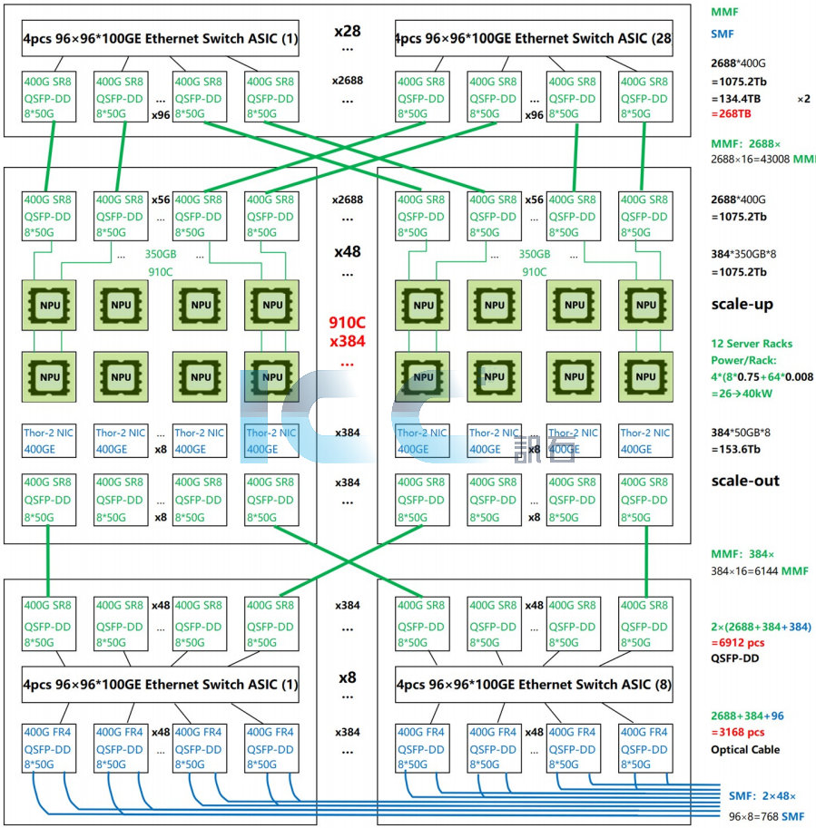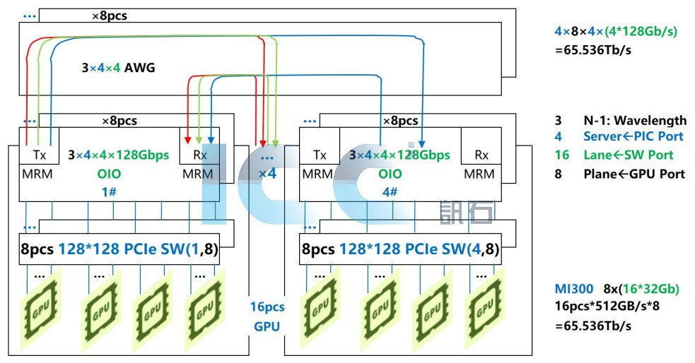 圖5還是采用和圖4一樣的AMD MI300 GPU和帶OBS控制輸出的128x128 PCIe5.0 Switch,雖然通道數(shù)達128,可是端口數(shù)只有8個,一般認為這限制了PCIe 交換網(wǎng)絡(luò)的可擴展性,引入波長路由光交換后的網(wǎng)絡(luò)可擴展性也有限。但是引入了Spine層波導路由光交換就完全不一樣了,比圖4的網(wǎng)絡(luò)規(guī)模更大,供應(yīng)鏈更成熟。這個系統(tǒng)的關(guān)鍵指標可以跨代碾壓成功的GB300 NVL72產(chǎn)品:2倍的總帶寬256*1024GBps=260TBps,2.4倍的顯存256*192GB=49TB,節(jié)點數(shù)更是高達256,還可以分散到多達16柜;柜間光互連使高單柜供電散熱難題消失;也沒必要采用1.6T/3.2T/CPO等高密度光電轉(zhuǎn)換,采用普通的成熟工藝光模塊性價比可能更高。