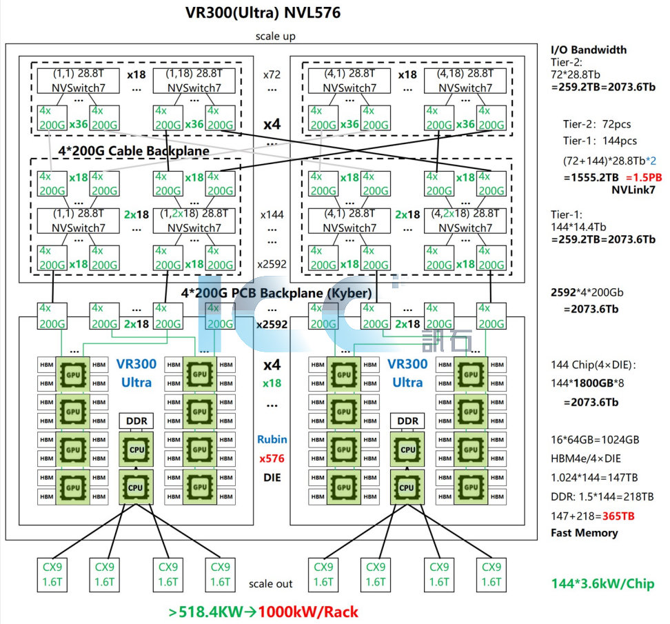 NVLink交換機以其低延遲、大通道數(shù)、高帶寬(通道數(shù)乘以單通道速率)成為GPU互聯(lián)的領(lǐng)先技術(shù)方案,NVSwitch5.0單通道速率達到200Gbps,單芯片單向帶寬達到72*2*200G=28.8Tbps=3600GBps,問題是NVSwitch5.0~7.0單向帶寬都是3600GBps,考慮到下一代GPU Rubin的I/O帶寬達單向1.8TBps=18*4*200Gbps,造成NVSwitch7.0的端口數(shù)從前兩代的72反而降低到3.6TBps*8/(4*200Gbps)=36,可見單層交換網(wǎng)絡(luò)已觸及網(wǎng)絡(luò)規(guī)模的天花板,難以繼續(xù)滿足大模型對硬件規(guī)模指數(shù)增長的要求。下一代GPU集群VR300 NVL576只能撿起NVLink4.0時代GH200和NVLink5.0時代GB200 NVL576放棄的兩層交換網(wǎng)絡(luò)來擴大網(wǎng)絡(luò)節(jié)點數(shù),為了保證系統(tǒng)的可靠性、成本、總功耗、總成本等指標,放棄引入前兩代失敗的光互連,光退銅進,采用正交背板+銅纜的純電互聯(lián),兩層交換芯片的總帶寬達到恐怖的雙向(72+144)*3.6TBps*2=1.5PB!這還帶來一個更嚴重的問題:這個576卡的超大集群只能塞進單柜中,單柜功耗將飆升至接近1000kW[4],這是在挑戰(zhàn)供電、散熱、運維等工業(yè)極限,量產(chǎn)難度將遠超成功的GB300 NVL72產(chǎn)品,那只有120kW單柜功耗,都遇到了各種工藝問題和延期。如圖2,這條技術(shù)路線可能具有更大的不確定性。
