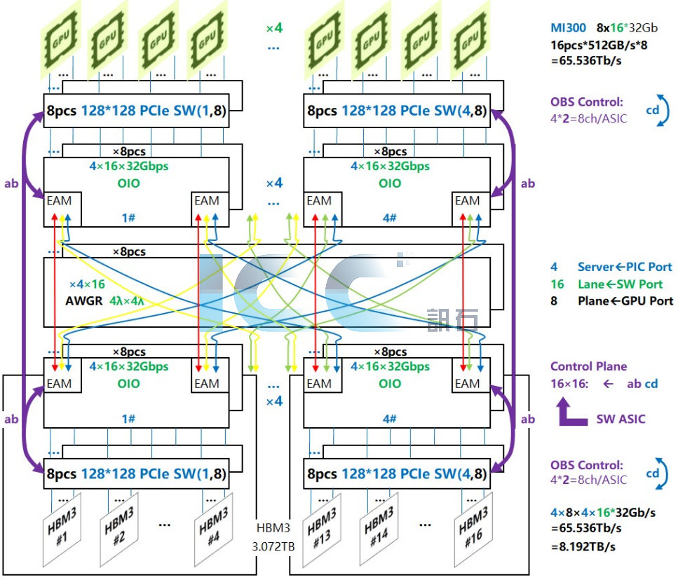 為打破限制PCIe-GPU互聯(lián)的瓶頸,波長路由光交換獲得重視[7] [8],特別是GPU和顯存池之間全帶寬低延遲多節(jié)點任意互聯(lián),打破存儲墻,成為GPU scale-up互聯(lián)的另外一種更為直接的技術(shù)路線。圖4是最小規(guī)模的波長路由交換系統(tǒng),采用16顆AMD上一代GPU MI300,16節(jié)點HBM3顆粒組成顯存池,他們之間全帶寬任意互聯(lián)16pcs* 512GBps*8=65.536Tbps,由兩跳Leaf層PCIe交換芯片加一跳Spine層波長路由光交換完成。完成波長路由交換(4x4)的是陣列波導光柵路由選擇器AWGR,但是完成納秒級波長切換的是4波光源,其控制信號(圖中ab)來自Leaf層交換芯片,所以從電域看來,這根本不是光包交換OPS,和波導路由光交換一樣,本質(zhì)上都是控制面和數(shù)據(jù)面分離的光突發(fā)交換OBS[9],雖然一般認為這是目前唯一可實現(xiàn)的光包交換OPS,因為從光域看來,承載目標地址的光標記信息可以加載到光波長上避免與數(shù)據(jù)面分離。