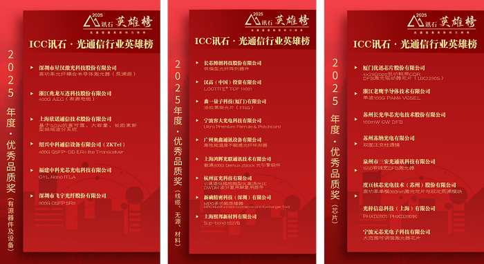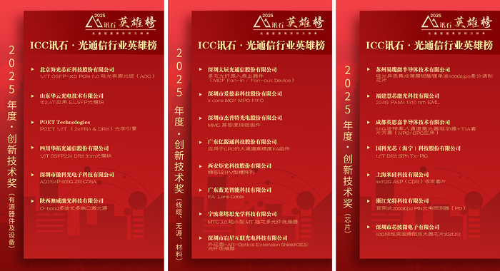 第十二屆ICC訊石·光通信行業(yè)英雄榜評(píng)選結(jié)果在IFOC訊石光通信大會(huì)·年度論壇暨2025“訊石英雄榜”頒獎(jiǎng)典禮正式揭曉,共公布7類獎(jiǎng)項(xiàng)名單,在超過(guò)150款光通信產(chǎn)業(yè)申報(bào)提名產(chǎn)品中,評(píng)選出70款優(yōu)秀產(chǎn)品代表,包括2025年度產(chǎn)品類“最具競(jìng)爭(zhēng)力產(chǎn)品”、“具競(jìng)爭(zhēng)力設(shè)備”、“優(yōu)秀品質(zhì)獎(jiǎng)”、“創(chuàng)新技術(shù)獎(jiǎng)”、“優(yōu)秀設(shè)備獎(jiǎng)”五大獎(jiǎng)項(xiàng),及20家入選企業(yè)/團(tuán)隊(duì)類“最具成長(zhǎng)力企業(yè)”、“最佳市場(chǎng)突破企業(yè)”二大獎(jiǎng)項(xiàng),同時(shí)還公布“產(chǎn)學(xué)研投融合獎(jiǎng)”、“技術(shù)創(chuàng)新”和”市場(chǎng)精英獎(jiǎng)“等7位獲得者。評(píng)選出2025年度光通信行業(yè)乘風(fēng)破浪、創(chuàng)新向上的企業(yè)、產(chǎn)品/技術(shù)以及先進(jìn)個(gè)人名單,表彰引領(lǐng)行業(yè)做出突出貢獻(xiàn)的產(chǎn)品和技術(shù),鼓勵(lì)具有成長(zhǎng)潛力的行業(yè)生力軍,助力企業(yè)產(chǎn)品和項(xiàng)目更好地洞悉市場(chǎng)環(huán)境與跨界趨勢(shì),實(shí)現(xiàn)跨越式發(fā)展。