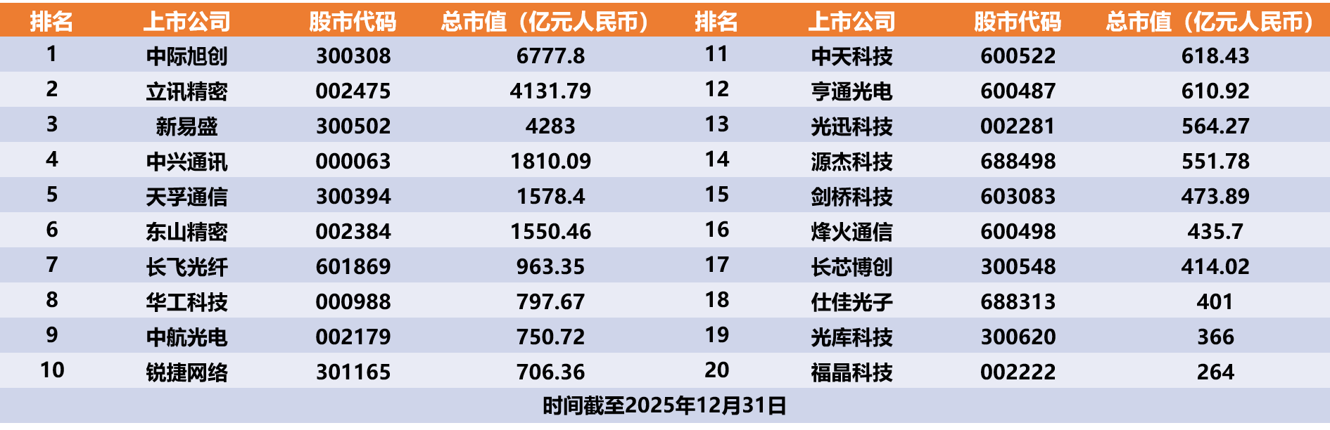 2025年光通信上市企業(yè)Top 20