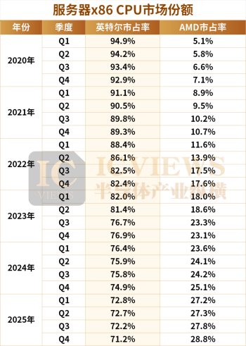 但這一雙寡頭格局正加速生變,英特爾長期以來的主導(dǎo)地位持續(xù)承壓,AMD 則憑借技術(shù)突破實現(xiàn)份額穩(wěn)步攀升。