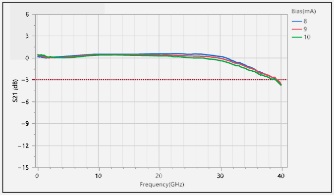 圖4. 偏置電流為8 mA、9 mA與10 mA時(shí)的S21響應(yīng)曲線。?3 dB帶寬超過35 GHz。