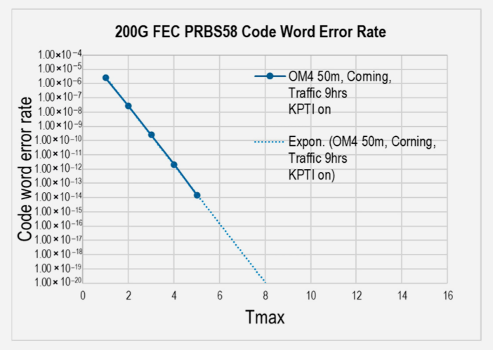 53–56 GBd的PAM4VCSEL的設(shè)計(jì)、性能與可靠性已在其他文獻(xiàn)中討論[5]。為支持每通道200 Gbps的傳輸,850 nm VCSEL的帶寬與噪聲性能均已取得顯著提升。2024年3月,在OFC會(huì)議上,我們報(bào)告了“邁向每通道200G的VCSEL多模鏈路”[16],并演示了200 Gbps傳輸下未糾錯(cuò)誤碼率低于1×10??的結(jié)果。同年9月,在ECOC會(huì)議上,進(jìn)一步實(shí)現(xiàn)了未糾錯(cuò)誤碼率小于1×10??的200 Gbps多模鏈路傳輸。經(jīng)過持續(xù)改進(jìn),在2025年3月的OFC會(huì)議上,未糾錯(cuò)誤碼率達(dá)到了約1×10??。同次會(huì)議上,還在50米OM4鏈路上進(jìn)行了超過9小時(shí)的流量測試,期間僅出現(xiàn)最多5個(gè)可糾錯(cuò)的幀錯(cuò)誤(圖2),展現(xiàn)了優(yōu)異的鏈路穩(wěn)定性。