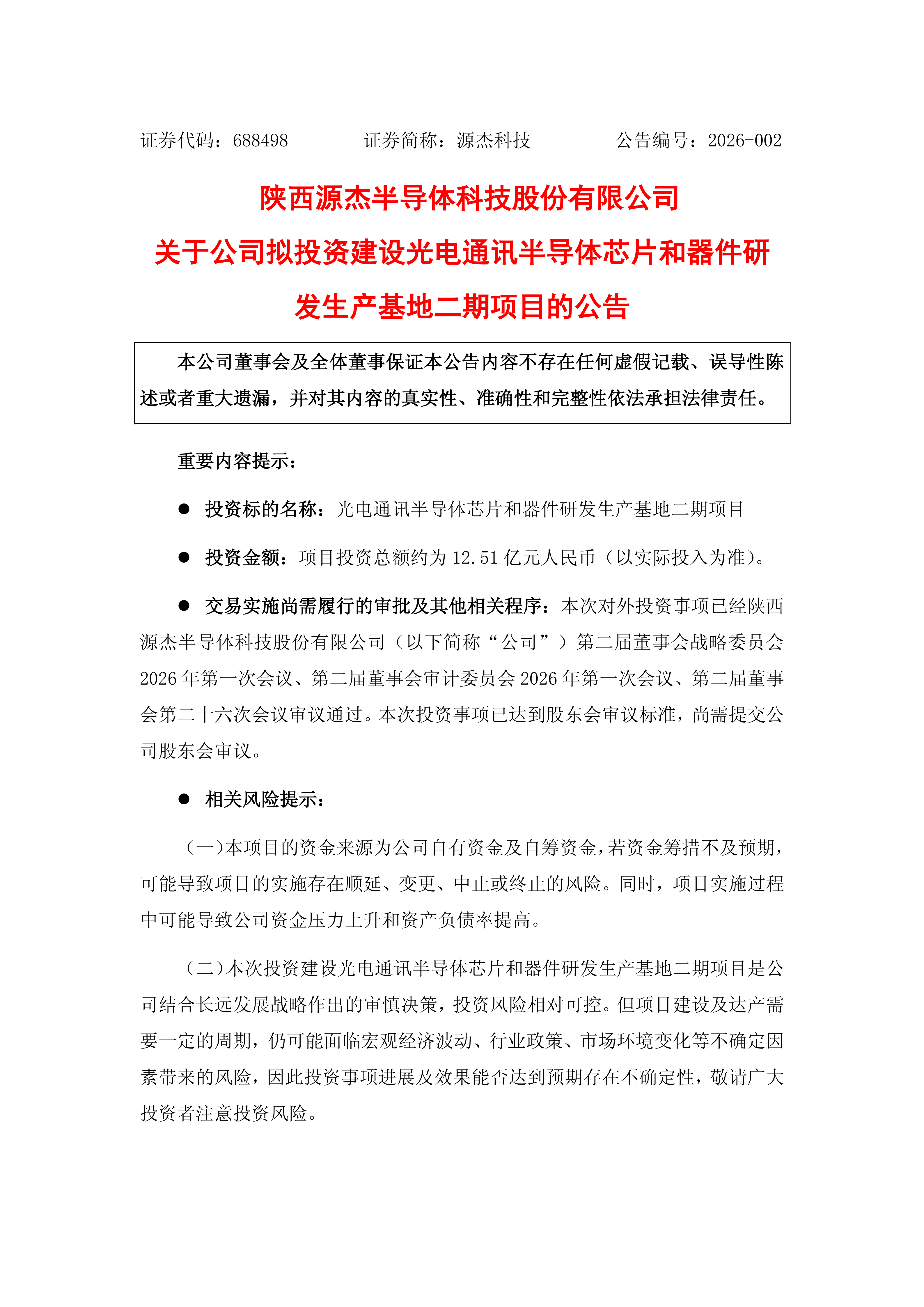 公司于 2026 年 2 月 9 日召開(kāi)第二屆董事會(huì)第二十六次會(huì)議,審議通過(guò)《關(guān)于公司擬投資建設(shè)光電通訊半導(dǎo)體芯片和器件研發(fā)生產(chǎn)基地二期項(xiàng)目的議案》,同時(shí)董事會(huì)授權(quán)公司董事長(zhǎng)及其授權(quán)人士辦理本次投資相關(guān)的具體事宜。本次投資事項(xiàng)已達(dá)到股東會(huì)審議標(biāo)準(zhǔn),尚需提交公司股東會(huì)審議。本次對(duì)外投資事項(xiàng)不涉及關(guān)聯(lián)交易,不屬于《上市公司重大資產(chǎn)重組管理辦法》規(guī)定的重大資產(chǎn)重組情況。