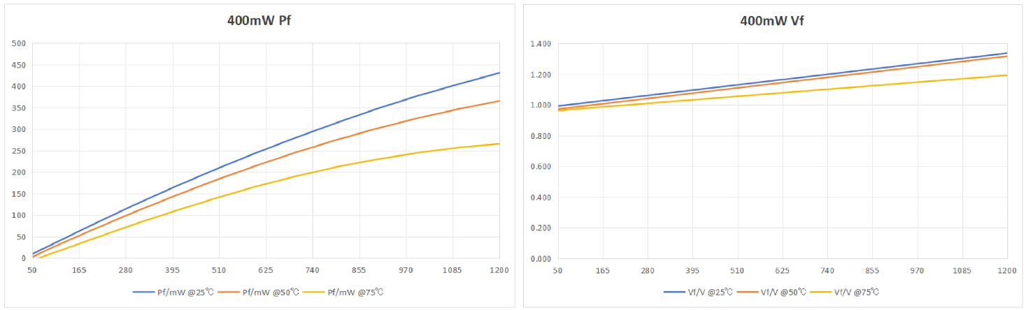 同時(shí),中科光芯更高功率200mW/400Mw/CWDM4多波長(zhǎng)產(chǎn)品也進(jìn)入送樣導(dǎo)入階段,客戶驗(yàn)證測(cè)試結(jié)果優(yōu)異,專為應(yīng)對(duì)共封裝光學(xué)(CPO)與硅光應(yīng)用的高性能需求而設(shè)計(jì),為下一代數(shù)據(jù)中心光互連與硅光集成提供了核心光源解決方案。如下圖所示,目前芯片25℃常溫條件下,輸出功率可達(dá)400mW,75℃高溫條件下,輸出功率260mW,指標(biāo)優(yōu)異。中科光芯1310nm CW高功率激光芯片具有InP MQW多量子阱結(jié)構(gòu),掩埋式波導(dǎo)。具有高熱穩(wěn)定性和高邊模抑制比(SMSR),高斜率效率和低相對(duì)強(qiáng)度噪聲(RIN),高可靠性,性能表現(xiàn)優(yōu)異,部分指標(biāo)優(yōu)于行業(yè)標(biāo)桿產(chǎn)品。芯片可滿足硅光及車載市場(chǎng)等多場(chǎng)景應(yīng)用。