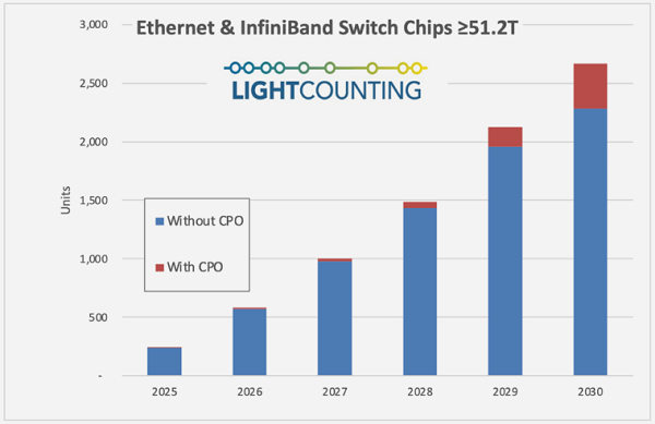 我們預(yù)估,包含共封裝光學(xué)(Co-packaged Optics,CPO)在內(nèi),以太網(wǎng)交換機(jī)芯片銷售額在2025至2030年間將以43%的年復(fù)合增長率增長。共封裝光學(xué)的影響因線性驅(qū)動可插拔光學(xué)(LPO)為每通道100G光模塊提供相近節(jié)能效果而有所延后。然而目前,每通道200G的共封裝光學(xué)交換機(jī)即將問世,首款產(chǎn)品為英偉達(dá)計劃于2025年下半年推出的InfiniBand共封裝光學(xué)交換機(jī),博通TH6-Davisson將于2026年緊隨其后。英偉達(dá)的公告提升了我們的近期預(yù)測,我們預(yù)計至2030年,共封裝光學(xué)將為交換機(jī)芯片市場帶來約47億美元增量。