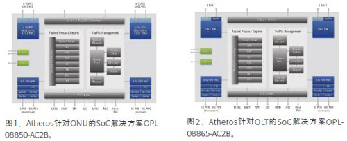 用于OLT產(chǎn)品的OPL-08865-AC2B(圖2)與OPL-08850-AC2B類似,同樣采用65nm CMOS制程、支持工業(yè)級應(yīng)用,和集成高性能32位MIPS24Kec內(nèi)核。此外,產(chǎn)品還兼容雙PON MAC(IEEE 802.3ah和 IEEE 802.3av標(biāo)準(zhǔn)),支持10G鏈路的FEC(Forward Error Correction)、可配置三重攪動及AES加密、基于硬件的動態(tài)帶寬分配(DBA)、彈性數(shù)據(jù)包分類算法等。