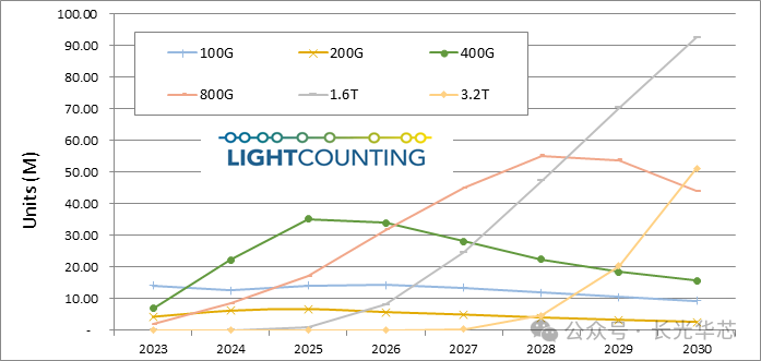圖1 2023-2030年不同速率光模塊的市場預(yù)測數(shù)據(jù)