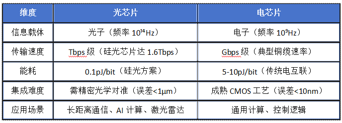 光芯片與電芯片的本質(zhì)差異體現(xiàn)在信息載體、能耗與應(yīng)用場景等幾個方面。光子以101?Hz頻率傳輸,支持Tbps級速率且能耗低至0.1pJ/bit;而電子受限于109Hz 頻率,速率與能耗均處于劣勢。這種差異決定了光芯片在長距離通信、AI計算等場景的不可替代性,而電芯片則在通用計算、控制邏輯等領(lǐng)域持續(xù)發(fā)揮價值。