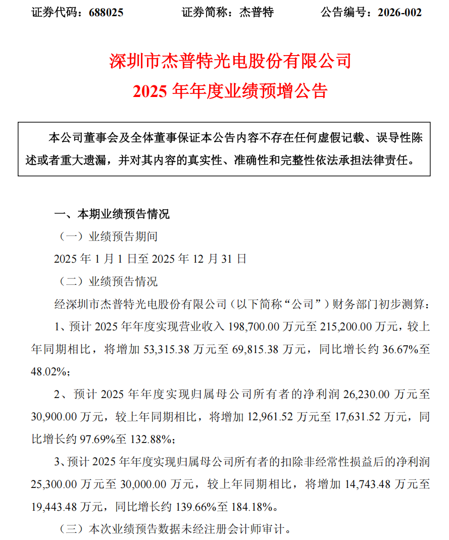 ICC訊 2026年1月30日,深圳市杰普特光電股份有限公司(證券代碼:688025,證券簡稱:杰普特)發(fā)布2025年年度業(yè)績預增公告。報告顯示,杰普特2025年營業(yè)收入預計實現(xiàn)198,700萬元至215,200萬元,同比增長36.67%至48.02%;歸母公司所有者的凈利潤預計達到26,230萬元至30,900萬元,同比大幅增長97.69%至132.88%;扣除非經(jīng)常性損益后的凈利潤預計為25,300萬元至30,000萬元,同比增長139.66%至184.18%。