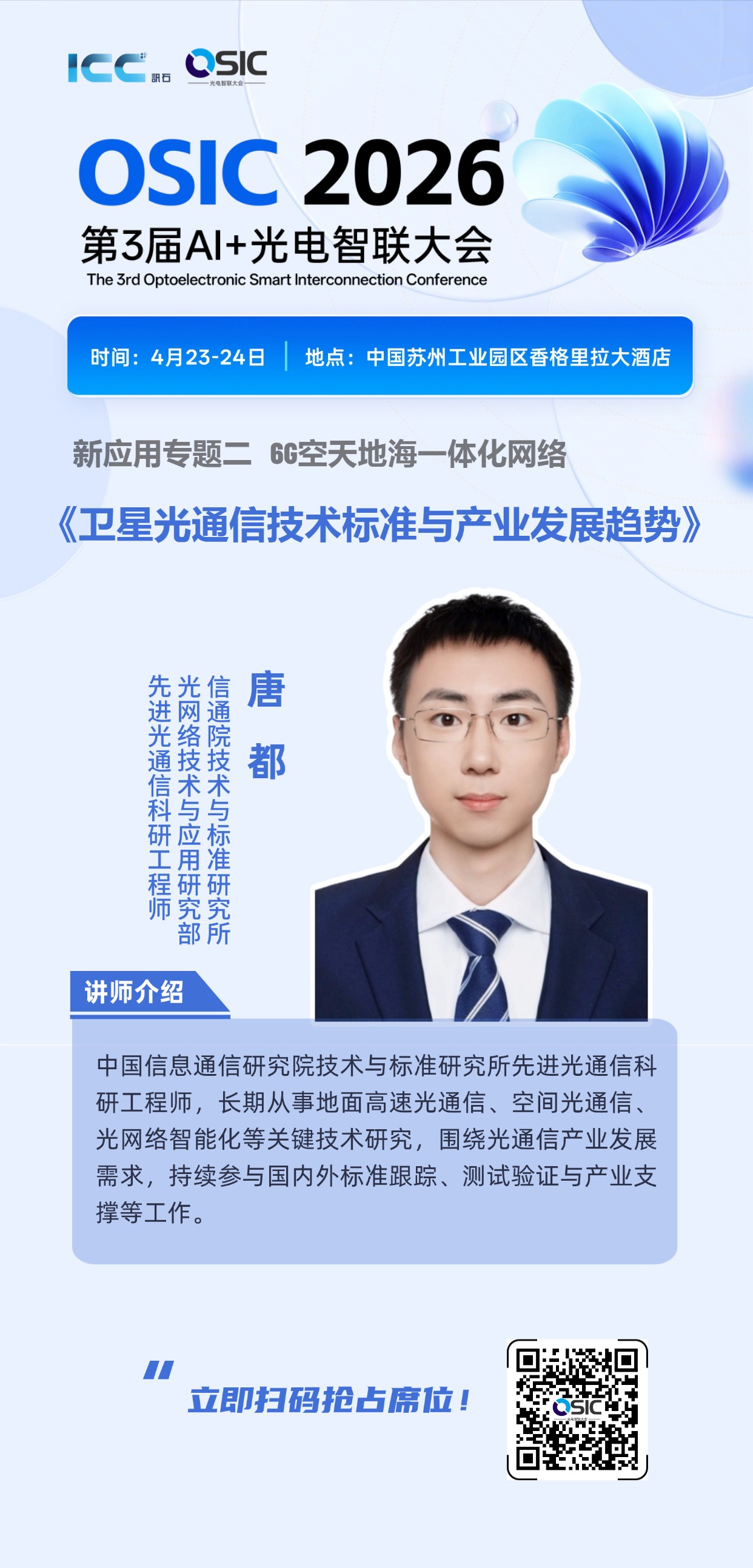 在第三屆 AI + 光電智聯(lián)大會(huì)上,信通院技術(shù)與標(biāo)準(zhǔn)研究所的光網(wǎng)絡(luò)技術(shù)與應(yīng)用研究部先進(jìn)光通信科研工程師——唐都將帶來(lái)《衛(wèi)星光通信技術(shù)標(biāo)準(zhǔn)與產(chǎn)業(yè)發(fā)展趨勢(shì)》主題演講,圍繞衛(wèi)星光通信技術(shù)標(biāo)準(zhǔn)與產(chǎn)業(yè)發(fā)展趨勢(shì),系統(tǒng)梳理衛(wèi)星光通信的關(guān)鍵技術(shù)路徑、標(biāo)準(zhǔn)化進(jìn)展及產(chǎn)業(yè)生態(tài)現(xiàn)狀,分析國(guó)內(nèi)外發(fā)展態(tài)勢(shì)與典型應(yīng)用方向,并展望衛(wèi)星光通信未來(lái)的產(chǎn)業(yè)機(jī)遇。