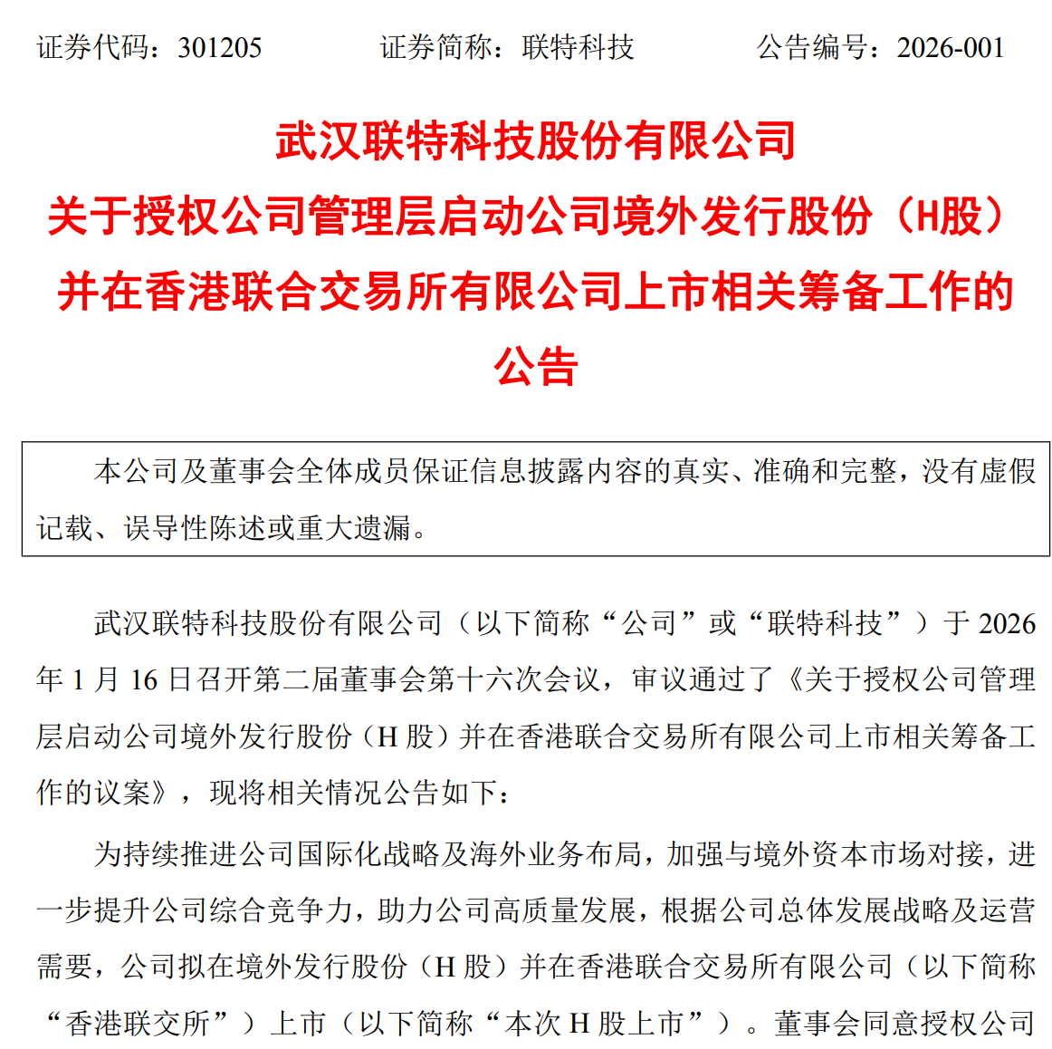 ICC訊 1月16日,武漢聯(lián)特科技股份有限公司(簡稱聯(lián)特科技)發(fā)布公告,聯(lián)特科技董事會啟動公司境外發(fā)行股份(H股)并在香港聯(lián)合交易所有限公司上市相關(guān)籌備工作。