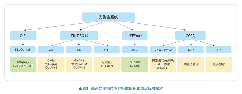 高速光傳輸技術(shù)涉及的標(biāo)準(zhǔn)組織包括ITU-T SG15、OIF、IEEE802.3以及國(guó)內(nèi)CCSA,各標(biāo)準(zhǔn)組織和重點(diǎn)標(biāo)準(zhǔn)技術(shù)如圖1所示。