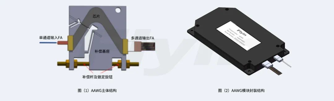 飛宇無熱陣列波導(dǎo)光柵(AAWG)模塊,使用機械補償方式來減小芯片隨溫度改變而產(chǎn)生的波長漂移影響,不需要額外供電,具有高穩(wěn)定性能和高可靠性能。從結(jié)構(gòu)上看,AAWG模塊主體上由單通道輸入FA、芯片、多通道輸出FA、補償基座、補償桿及鎖定旋鈕、封裝殼體等六部分組成詳見圖(1)、圖(2)。