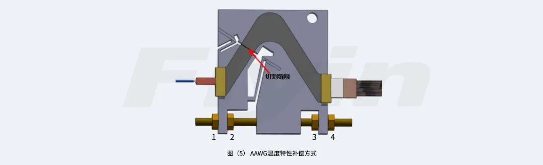 為了解決減小溫度對陣列波導(dǎo)芯片波長漂移影響,我司AAWG產(chǎn)品溫度特性補償實現(xiàn)工藝為:在芯片的輸入平板波導(dǎo)位置進(jìn)行縫隙切割,使芯片被分成兩部分(第一部分包含輸入波導(dǎo)部分輸入平板波導(dǎo),第二部分包含部分輸入平板波導(dǎo)、陣列波導(dǎo)、輸出平板波導(dǎo)以及輸出波導(dǎo))。目前我司在工藝實現(xiàn)中,采用特殊材質(zhì)和膨脹系數(shù)的補償基座和補償桿,實現(xiàn)芯片被切割的兩部分發(fā)生相對微小移動,達(dá)到對產(chǎn)品溫度特性補償,見圖(5)。