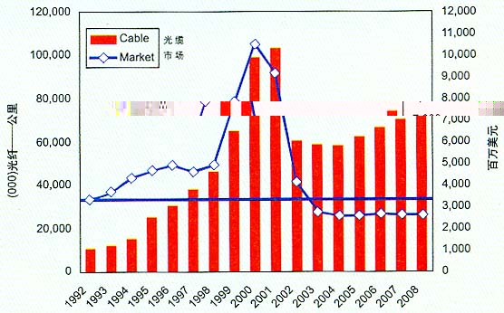 2000年和2001年電信業(yè)“泡沫”期間,北美、西歐和亞洲部分國家開始了新一輪長途電信網(wǎng)建設(shè)和大規(guī)模城域網(wǎng)建設(shè),同時(shí)為了支持寬帶業(yè)務(wù),大量敷設(shè)了大芯數(shù)光纜和G.655光纖。爆發(fā)式的需求增長,導(dǎo)致全球60多家光纖企業(yè),展開了規(guī)模空前的擴(kuò)產(chǎn),耗資約50億美元,世界光纖產(chǎn)能增長約70%。