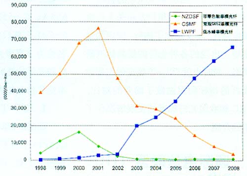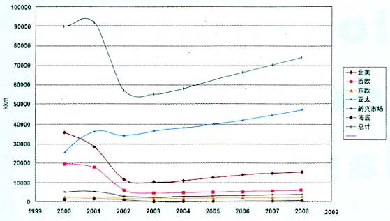 由KMI報(bào)告數(shù)據(jù)繪制的圖表可見(見圖2),2001年以后,北美及西歐光纖市場急急衰落,而亞太市場在微落之后一直穩(wěn)步上升。2002年世界陸地光纜光纖用量為5720萬公里,而亞太地區(qū)2002光纖敷設(shè)量為3160萬公里,占全球光纖需求量55%。2004年亞太光纖市場將占世界總需求量65%,2008年占63.4%。