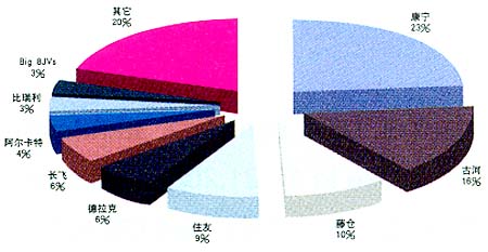 1999年開始康寧公司逐步收購了其合資伙伴在西康、澳康、英康公司中的股份,使該三公司成為美國康寧公司的全資子公司,2000年康寧公司又以l00多億美元完成了對(duì)西門子公司光纖光纜企業(yè)的并購,并投資12億美元擴(kuò)產(chǎn)光纖,以求達(dá)到壟斷世界l/2光纖和1/2光纜市場的目的。2001年日本古河公司收購了美國朗迅公司光纖部,使古河一躍為世界第二產(chǎn)纖大國。2004年阿爾卡特與荷蘭德拉克(Draka)公司決定合并光纖光纜業(yè)務(wù),這次整合使新公司(包括長飛)光纖產(chǎn)能2003年可能超過古河,圖3是根據(jù)KMl2004年報(bào)告公布數(shù)據(jù)繪制的世界九大公司光纖產(chǎn)量比例圖,由圖可見,阿爾卡特、長飛、德拉克三公司2003年光纖產(chǎn)量已占世界光纖總產(chǎn)量13%,阿爾卡特與德拉克整合后,世界光纖前三大公司產(chǎn)量將占世界總產(chǎn)量52%。由此可見,光纖產(chǎn)業(yè)是高度壟斷的產(chǎn)業(yè),為了提高競爭力,強(qiáng)強(qiáng)聯(lián)合或股權(quán)收購,讓最有生命力,在技術(shù)資金上具有優(yōu)勢(shì)的企業(yè)保存下來。未整合的企業(yè)如日本藤倉和住友電加大投入,使自己做強(qiáng)做大,其市場占有率也高達(dá)10%左右。