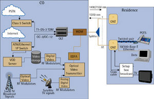 光纖主干在交換中心和分路器之間傳送光信號(hào),分路器可使多個(gè)ONT與同一條光纖相連。每個(gè)用戶都需要一個(gè)ONT,它可為不同服務(wù)(POTS、以太網(wǎng)和視頻)提供連接。一個(gè)FTTx網(wǎng)絡(luò)一般可向32個(gè)用戶提供服務(wù),而64個(gè)用戶的服務(wù)也已出現(xiàn)。