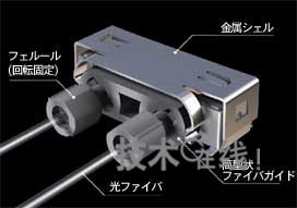 另外,為了方便插拔光纖及校準(zhǔn)光軸,還采用了“金屬箍旋轉(zhuǎn)機(jī)構(gòu)”。通過旋轉(zhuǎn)包覆在光纖上起固定作用的金屬箍,即可進(jìn)行插拔。光信號(hào)的可傳輸距離為數(shù)米以下。
