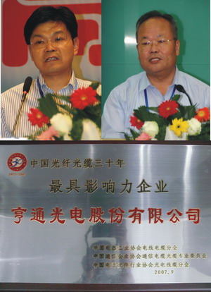 近日,由中國通信企業(yè)協(xié)會、中國電器工業(yè)協(xié)會和中國電子元件行業(yè)協(xié)會聯(lián)合主辦,由中國電器工業(yè)協(xié)會電線電纜分會、中國通信企業(yè)協(xié)會通信電纜光纜專業(yè)委員會、中國電子元件行業(yè)協(xié)會光電線纜分會和浙江省富陽市人民政府聯(lián)合承辦的“第三屆中國通信光電線纜產(chǎn)業(yè)高峰論壇”暨“中國光纖光纜三十年大會”在浙江省富陽市召開。同時在中國光纖光纜三十年表彰大會上,亨通光電被評為“中國光纖光纜三十年最具影響力企業(yè)”。