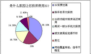 3G資費(fèi)過高,有38.1%持這種觀點(diǎn);其次,覺得換手機(jī)、換手機(jī)號(hào)麻煩的也占到33.3%;有16.7%的拒絕使用者認(rèn)為,