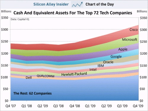 數(shù)據(jù)顯示,從2007年底到2009年底,美國(guó)10家最為富有的科技公司的現(xiàn)金儲(chǔ)備增長(zhǎng)了48%,至2100億美元。標(biāo)準(zhǔn)普爾500指數(shù)成分股 中的其他65家科技公司同期現(xiàn)金儲(chǔ)備只增長(zhǎng)了13%,至1180萬美元。