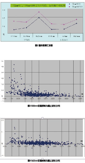 由圖3可明顯看出1625nm的數(shù)據(jù)較1550nm窗口下宏彎損耗分散,實(shí)際數(shù)據(jù)證實(shí)長波長對(duì)彎曲的敏感程度更甚。