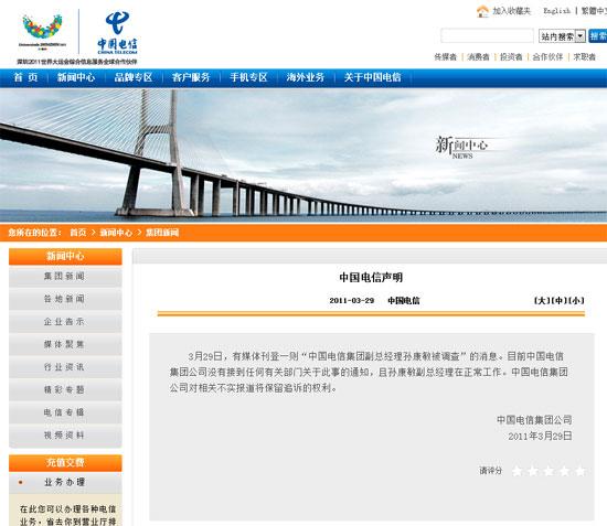 3月30日消息,中國電信集團公司昨日在其網(wǎng)站發(fā)布聲明稱,集團副總經(jīng)理孫康敏在正常工作,目前沒有接到任何有關(guān)部門關(guān)于孫康敏被調(diào)查的通知。