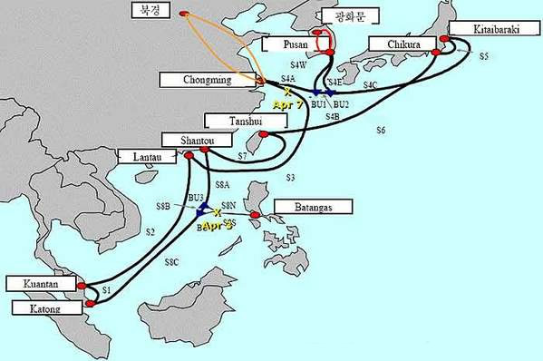1.APCN2(亞太二號(hào))海底光纜:帶寬:2.56Tbps 長度:19000km 經(jīng)過地區(qū):中國大陸、香港、臺(tái)灣、日本、韓國、馬來西亞、菲律賓。 入境地點(diǎn):汕頭,上海。 連接亞洲國家和地區(qū)的亞太2號(hào)海底光纜系統(tǒng),是目前重要的國際光纜之一全長約19000公里,共有10個(gè)登陸站。中國登陸站在上海崇明和廣東汕頭,其他登 陸方還有日本、韓國、香港、馬來西亞、新加坡、菲律賓和中國臺(tái)灣。該系統(tǒng)的傳輸速率為10Gb/s x 64個(gè)波長,共有四對光纖組成。該系統(tǒng)采用了具有自逾功能的環(huán)型網(wǎng)絡(luò)結(jié)構(gòu),終期容量為2560Gb/s。該系統(tǒng)于200