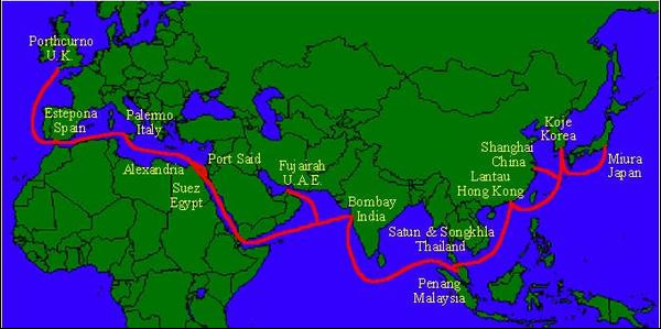 3.SEA-ME-WE 3(亞歐)海底光纜:帶寬:960Gbps 長度:39000km 經(jīng)過地區(qū):東亞,東南亞,中東,西歐。 入境地點(diǎn):汕頭,上海。 連接亞洲、中東和歐洲的亞歐海底光纜系統(tǒng),全長39000公里,連接了33個(gè)國家和地區(qū),工友39個(gè)登陸站。該系統(tǒng)為分支型網(wǎng)絡(luò)結(jié)構(gòu),中國登陸站在上海崇 明和廣東汕頭,傳輸速率為2.5Gb/s x 8個(gè)波長,并將擴(kuò)容到16個(gè)波長。該系統(tǒng)共有兩對光纖,于1999年12月開通投產(chǎn)。