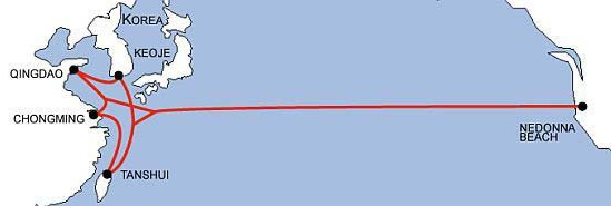 2.CUCN(中美)海底光纜:帶寬:2.2Tbps 長度:30000km 經(jīng)過地區(qū):中國大陸,臺(tái)灣,日本,韓國,美國。 入境地點(diǎn):汕頭,上海。 連接亞洲和北美洲的中美海底光纜系統(tǒng),是目前重要的國際光纜之一,全長約30000公里,共有9個(gè)登陸站,中國的登陸站分別為上海崇明和廣東汕頭。其他 登陸方還有日本、韓國、美國和中國臺(tái)灣。該系統(tǒng)的傳輸速率為2.5Gb/s x8個(gè)波長,共有四對光纖組成,采用具有自逾功能的環(huán)型網(wǎng)絡(luò)結(jié)構(gòu)。該系統(tǒng)于2000年1月開通部分段落。