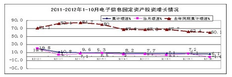 今年1-10月,電子信息產(chǎn)業(yè)固定資產(chǎn)投資增速呈逐月下滑態(tài)勢(shì)。其中,電子器件和信息機(jī)電行業(yè)投資下滑最為明顯,同比下降11.8%和10.2%;其中半導(dǎo)體分立器件投資前10個(gè)月中下降21%,光電器件投資下降4%,光纖光纜下降16%。廣播電視、家用視聽和通信設(shè)備行業(yè)投資規(guī)模雖小,但增勢(shì)突出。