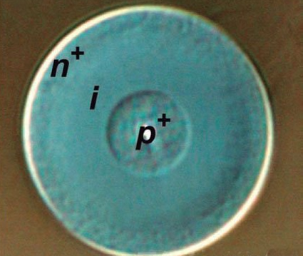 PSU化學教授John Badding等的研究小組采用以同心圓狀制備p+型、i型及n+型硅半導體的技術,在光纖的核心部分制備了pin結(圖1)。具體做法是用高壓化學氣相沉積法(CVD)向中空的光纖內(nèi)部吹入硅烷(SiH4)氣體,通過溫度控制等使其結晶而成。