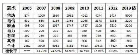 4月份有一篇對(duì)2012年中國光纖光纜市場的總結(jié)文章,文中給出一張?jiān)醋試抛C券的數(shù)據(jù)圖表,列出2006年以來歷年運(yùn)營商光纖光纜的需求量。從圖表中可以清楚看到2008-2009年3G牌照發(fā)放對(duì)光纖光纜市場的巨大作用。相比之下2012年也是光纖光纜市場的好年,這可能要拜寬帶建設(shè),也許還有韋總所說的光纜壽命到期的影響吧。從這張圖表看,如果4G建設(shè)啟動(dòng),中國的光纖光纜市場重現(xiàn)幾年前坐等客戶上門拉貨的景象也未必不可能。從這個(gè)圖表還可以看到,2006年以來,即便沒有重大利好,中國光纖光纜市場仍可保持10%以上的增速。這樣的增速到什么時(shí)候會(huì)開始放慢,也是一個(gè)饒有興趣的問題,估計(jì)會(huì)和中國經(jīng)濟(jì)的增速有某種相關(guān)性。如果有時(shí)間,我們或許可以從統(tǒng)計(jì)的角度找找兩者之間有什么樣的關(guān)系。