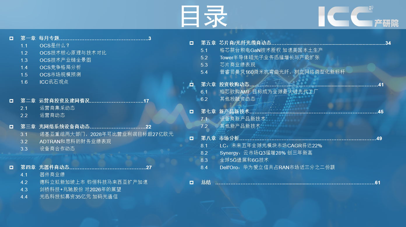 ICC訊 ICC訊石最新發(fā)布的《全球光通訊市場(chǎng)動(dòng)態(tài)月報(bào)(2025年11月刊)》。此次報(bào)告分析了光通信熱點(diǎn)技術(shù)OCS、匯集了運(yùn)營(yíng)商集采投資、設(shè)備與器件商動(dòng)態(tài)、芯片商進(jìn)展、收購(gòu)?fù)度谫Y、新產(chǎn)品技術(shù)及市場(chǎng)數(shù)據(jù)等多維度熱點(diǎn)動(dòng)態(tài),為行業(yè)參與者提供關(guān)鍵決策參考。月報(bào)已通過(guò)郵件發(fā)送至?xí)T郵箱,敬請(qǐng)查收,如有疑問(wèn)歡迎聯(lián)系:15989420950 馮經(jīng)理。