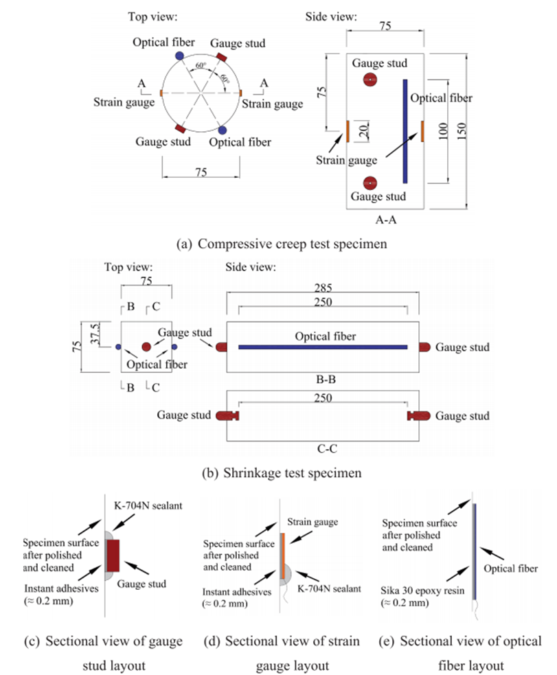 傳統(tǒng)應(yīng)變片、便攜式應(yīng)變儀及收縮比對(duì)儀等監(jiān)測(cè)技術(shù)存在易受環(huán)境干擾、數(shù)據(jù)波動(dòng)性大、無法捕捉全場(chǎng)應(yīng)變分布等局限,難以實(shí)現(xiàn)超高強(qiáng)海砂混凝土長期蠕變與收縮的精準(zhǔn)監(jiān)測(cè)。為此本研究采用基于光頻域反射(OFDR)技術(shù)的分布式光纖傳感器(DOFS),使用Sika 30環(huán)氧樹脂膠將聚酰亞胺(PI)涂層光纖粘貼于試件表面,開展長期間歇監(jiān)測(cè),并在50%相對(duì)濕度、75%相對(duì)濕度及密封三種環(huán)境條件下,與傳統(tǒng)方法進(jìn)行系統(tǒng)性能對(duì)比,驗(yàn)證其監(jiān)測(cè)有效性。