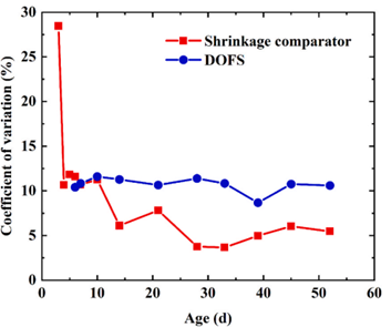蠕變?cè)囼?yàn)中,OFDR測(cè)量的變異系數(shù)(CV)均值僅5.60%,較應(yīng)變片(23.22%)降低76%,較便攜式應(yīng)變儀(16.07%)降低65%;收縮試驗(yàn)中其CV穩(wěn)定在8.68%-11.60%,曲線增長趨勢(shì)平穩(wěn),數(shù)據(jù)離散性顯著低于傳統(tǒng)方法。