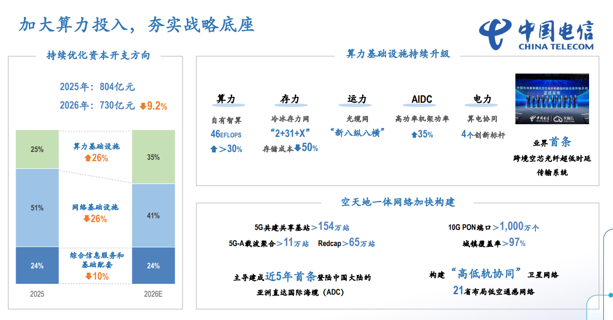 網(wǎng)絡(luò)基礎(chǔ)設(shè)施投資持續(xù)深化共建共享,全年投入407億元,聚焦重點(diǎn)區(qū)域與場(chǎng)景精準(zhǔn)建設(shè)。公司打造千兆光網(wǎng) 10G PON 端口超1000萬(wàn)個(gè),城鎮(zhèn)千兆住宅覆蓋率超 97%;持續(xù)推進(jìn) 5G-A 網(wǎng)絡(luò)能力升級(jí),在 300 多個(gè)城市規(guī)模部署 5G-A 載波聚合超 11 萬(wàn)站和 Redcap 超 65 萬(wàn)站,5G 網(wǎng)絡(luò)實(shí)現(xiàn)全國(guó)鄉(xiāng)鎮(zhèn)及以上區(qū)域連續(xù)覆蓋。此外,綜合信息服務(wù)和基礎(chǔ)配套投資 195 億元,為全業(yè)務(wù)發(fā)展提供全方位保障。
