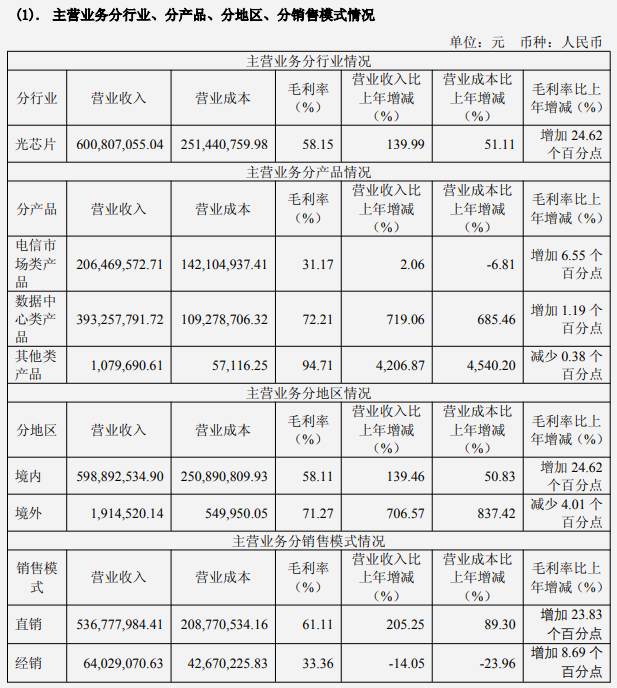 從分行業(yè)來看,公司核心業(yè)務(wù)光芯片板塊實現(xiàn)營業(yè)收入6.01億元,同比增長139.99%,毛利率為58.15%,比上年同期大幅增加24.62個百分點。