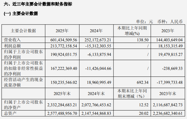 ICC訊 2026年3月25日,陜西源杰半導(dǎo)體科技股份有限公司發(fā)布2025年年度報告。報告顯示,公司全年實現(xiàn)營業(yè)收入6.01億元,較上年同期的2.52億元增長138.50%;歸屬于上市公司股東的凈利潤為1.91億元,與上年同期的虧損613萬元相比,實現(xiàn)扭虧為盈。歸屬于上市公司股東的扣除非經(jīng)常性損益的凈利潤為1.67億元,同樣實現(xiàn)扭虧。