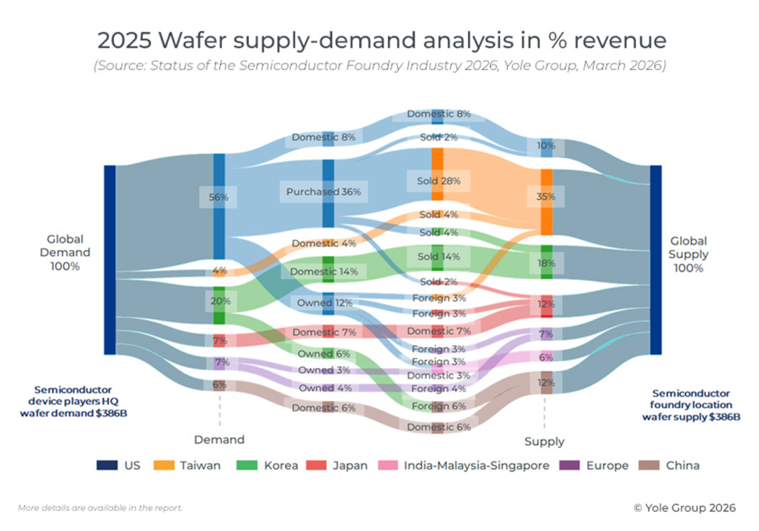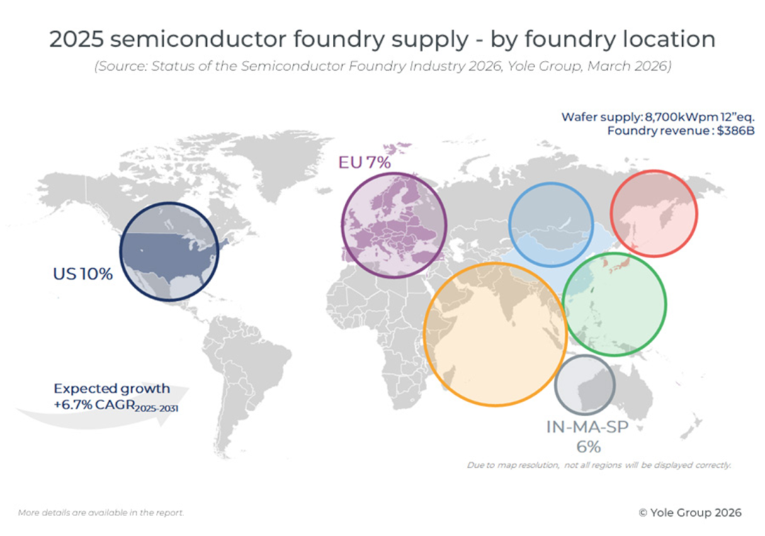 ICC訊 半導(dǎo)體代工需求結(jié)構(gòu)圍繞著“自制或外購”的決策展開:集成器件制造商 (IDM) 保留內(nèi)部制造能力,但越來越多地依賴外部代工廠;而無晶圓廠廠商則幾乎完全依賴海外產(chǎn)能。到 2025 年,美國仍將是唯一一個(gè)存在結(jié)構(gòu)性需求過剩的地區(qū),需要依賴亞洲代工廠來支持其國內(nèi)器件公司。供應(yīng)高度集中在亞洲,以中國大陸、韓國和中國臺灣為主導(dǎo),僅中國大陸就占全球代工產(chǎn)能的 26% 以上,而其器件收入份額卻僅占約 6%。