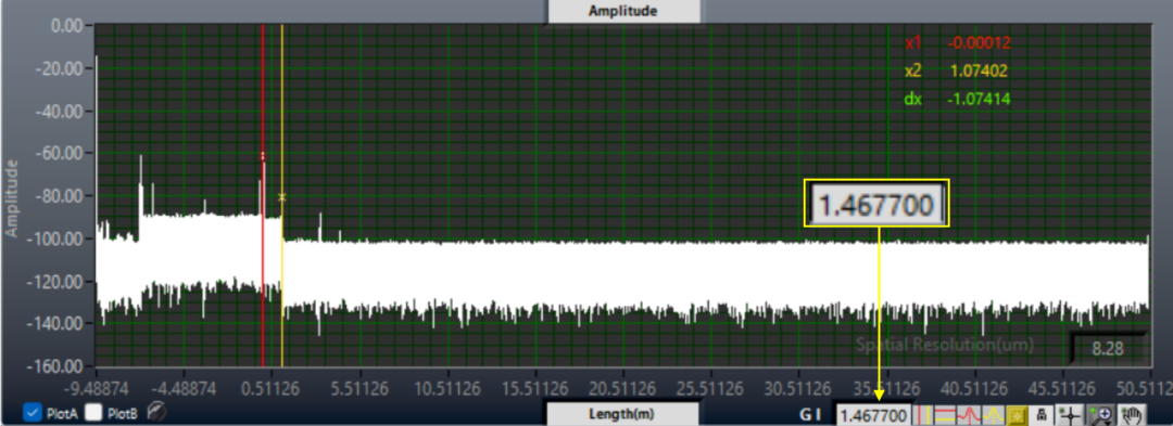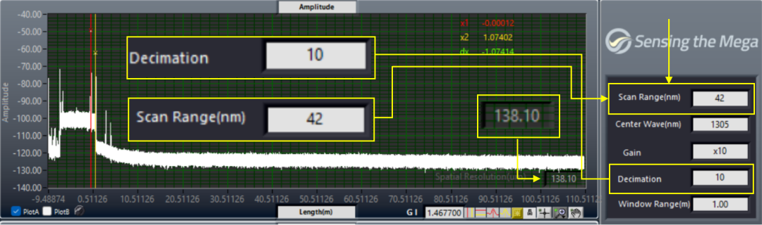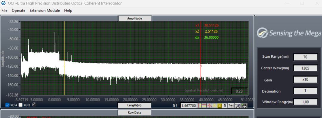 如圖標(biāo)記的窗口所示,在圖上的配置參數(shù)下,儀器空間分辨率為138.10μm,我們可以通過Scan Range(波長(zhǎng)掃描范圍)和Decimation(降點(diǎn))來設(shè)置空間分辨率,當(dāng)我們將波長(zhǎng)掃描范圍設(shè)為“70”,降點(diǎn)設(shè)為“1”時(shí),此時(shí)空間分辨率為8.28μm。