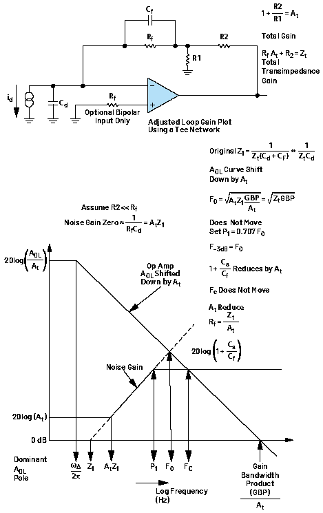 6. 由1+ Cs/Cf設(shè)定的高頻噪聲增益(NG)因At增益而下移,同時放大器Aol曲線也因At而下移,因此Fc頻率處于與無T型網(wǎng)絡(luò)的設(shè)計相同的位置。