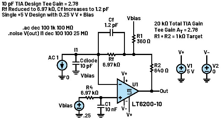 第一部分首先介紹了基本TIA設(shè)計的一種簡化補(bǔ)償流程,隨后通過添加一個T型網(wǎng)絡(luò),成功地將所需的補(bǔ)償電容提升到高于寄生電容的水平。第二部分將展示該T型網(wǎng)絡(luò)對電路環(huán)路增益(LG)圖的影響,并闡明這一影響與T型網(wǎng)絡(luò)設(shè)計代數(shù)之間的對應(yīng)關(guān)系。