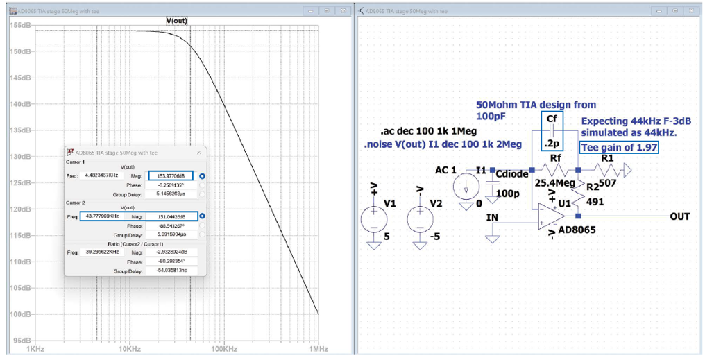 為了展示該T型網(wǎng)絡(luò)技術(shù)的應(yīng)用優(yōu)勢,我們基于一個100 pF檢波器,并使用單位增益穩(wěn)定型AD8065 JFET輸入FastFET?器件,實(shí)現(xiàn)了一個50 MΩ設(shè)計。本文給出的設(shè)計方程同樣適用于這款單位增益穩(wěn)定、67 MHz GBP、超低輸入偏置電流的器件。TIA增益非常高時,最好使用JFET或CMOS輸入,以便消除輸入偏置電流經(jīng)過反饋電阻所導(dǎo)致的輸出直流失調(diào)。簡易設(shè)計需要0.1 pF Cf,此值過低,難以實(shí)現(xiàn)。若以Rf電阻的0.2 pF寄生電容為目標(biāo),則需要圖5所示的T型網(wǎng)絡(luò)設(shè)計,其中Rf元件從50 MΩ降至25.4 MΩ,相對較低的R1和R2元件提供1.97的At增益。測試仿真結(jié)果顯示,巴特沃斯響應(yīng)的F-3dB確實(shí)出現(xiàn)在預(yù)期的44 kHz。