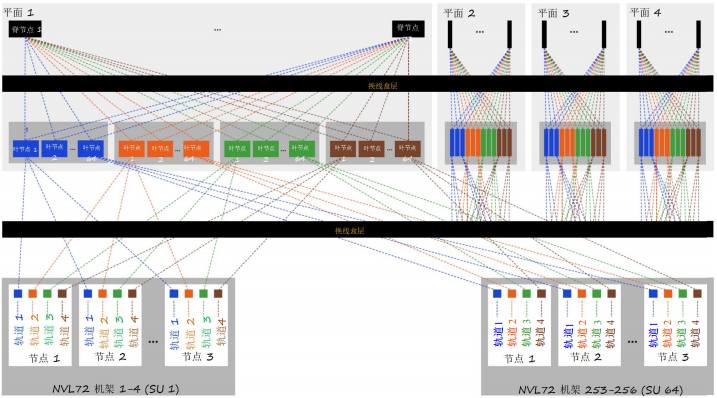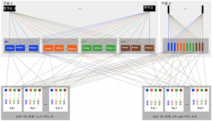 - 每個(gè)GPU連接到兩個(gè)獨(dú)立的平面,以實(shí)現(xiàn)負(fù)載均衡和冗余。