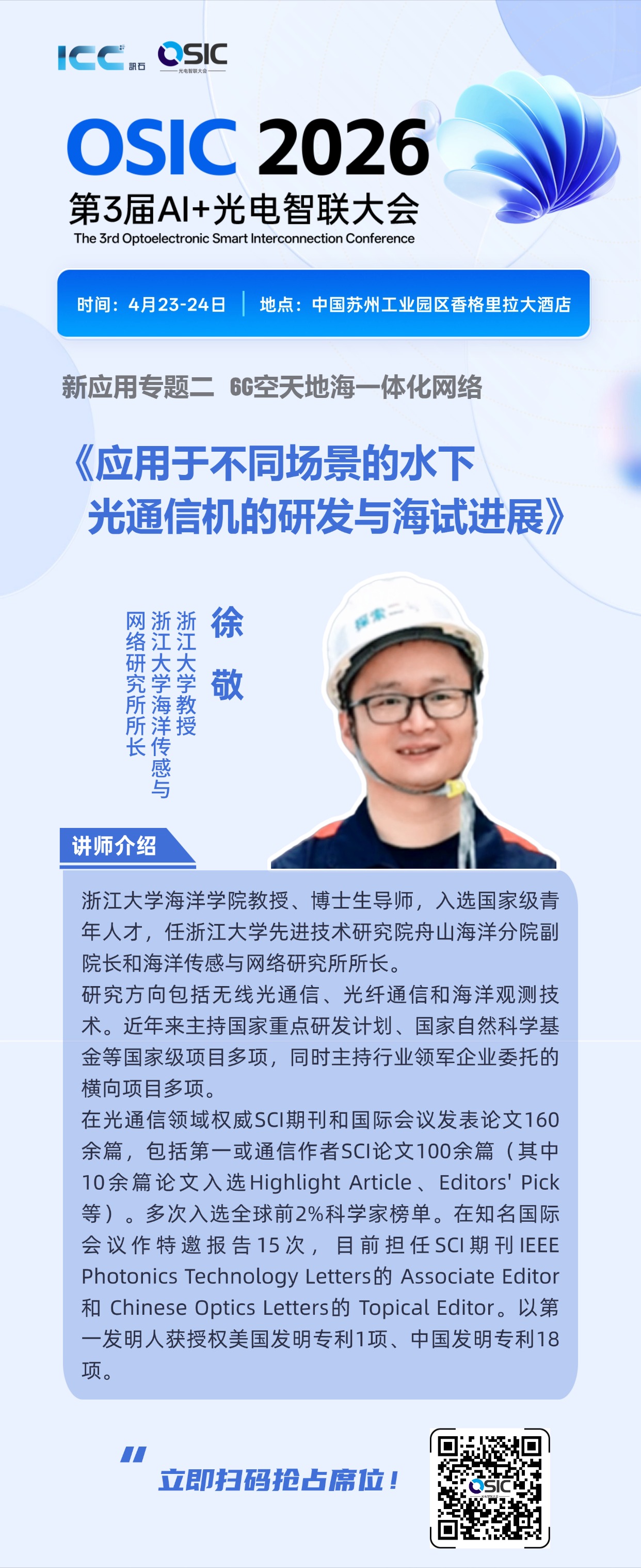 ICC訊 4 月 23–24 日 OSIC 2026 第3屆AI+光電智聯(lián)大會(huì)以“跨界融合?智聯(lián)未來”為主題,深挖OFC新趨勢(shì)、開拓光通信跨界新應(yīng)用,會(huì)議采用2(主論壇)+4(專題論壇)+N(閉門論壇、產(chǎn)品展、人才招聘展、休閑活動(dòng)等)會(huì)議模型,圍繞市場(chǎng)、技術(shù)、資本、人才四大維度展開,以AI算力光互聯(lián)為核心,延伸至6G空天地海一體化、車路云智能網(wǎng)聯(lián)、具身智能互聯(lián)等前沿領(lǐng)域與1500位與會(huì)嘉賓共同討論。